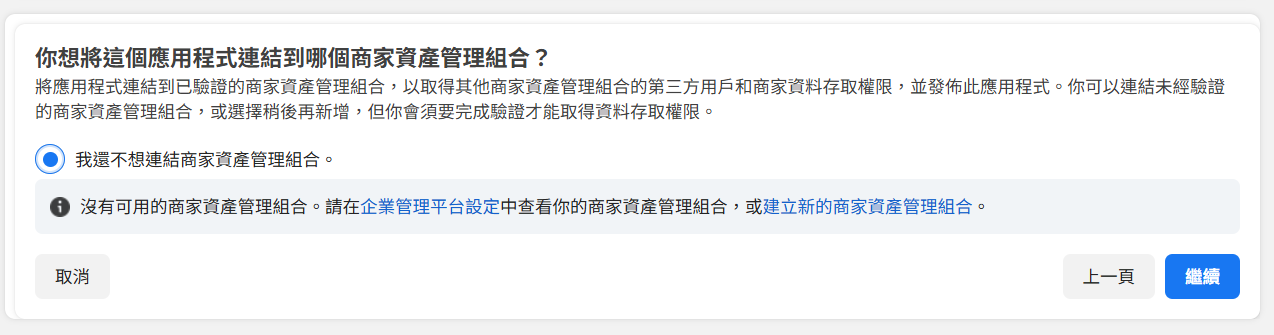 選我還不想連結商家資產管理組合。 繼續
