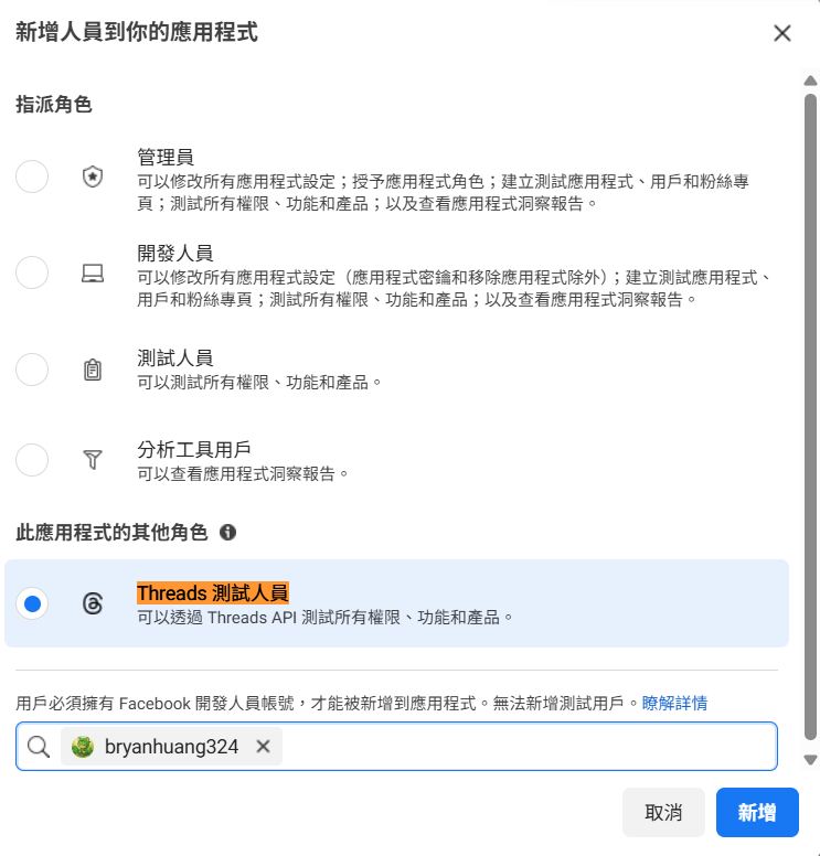 選threads 測試人員 並輸入自己的threads帳號